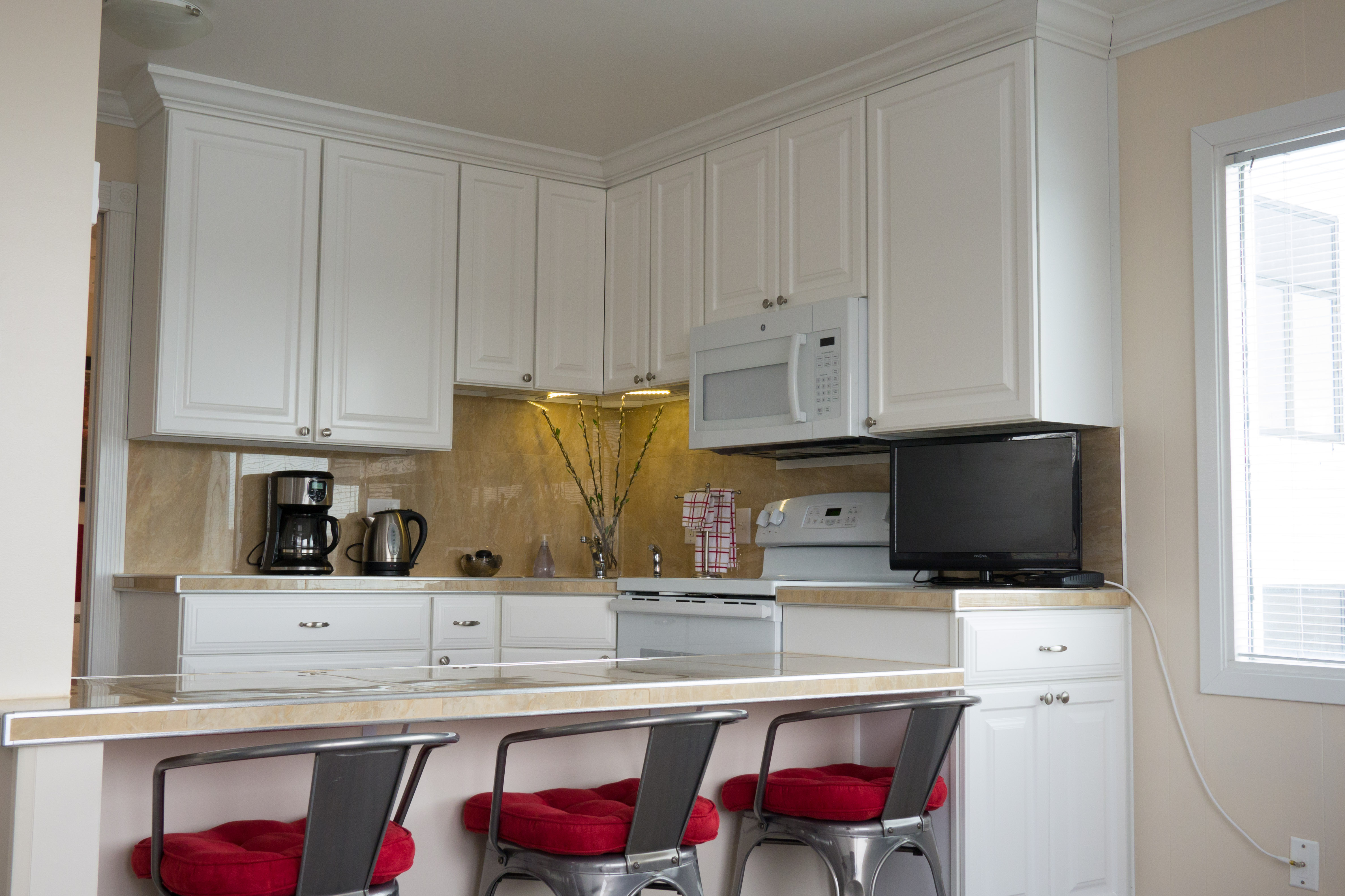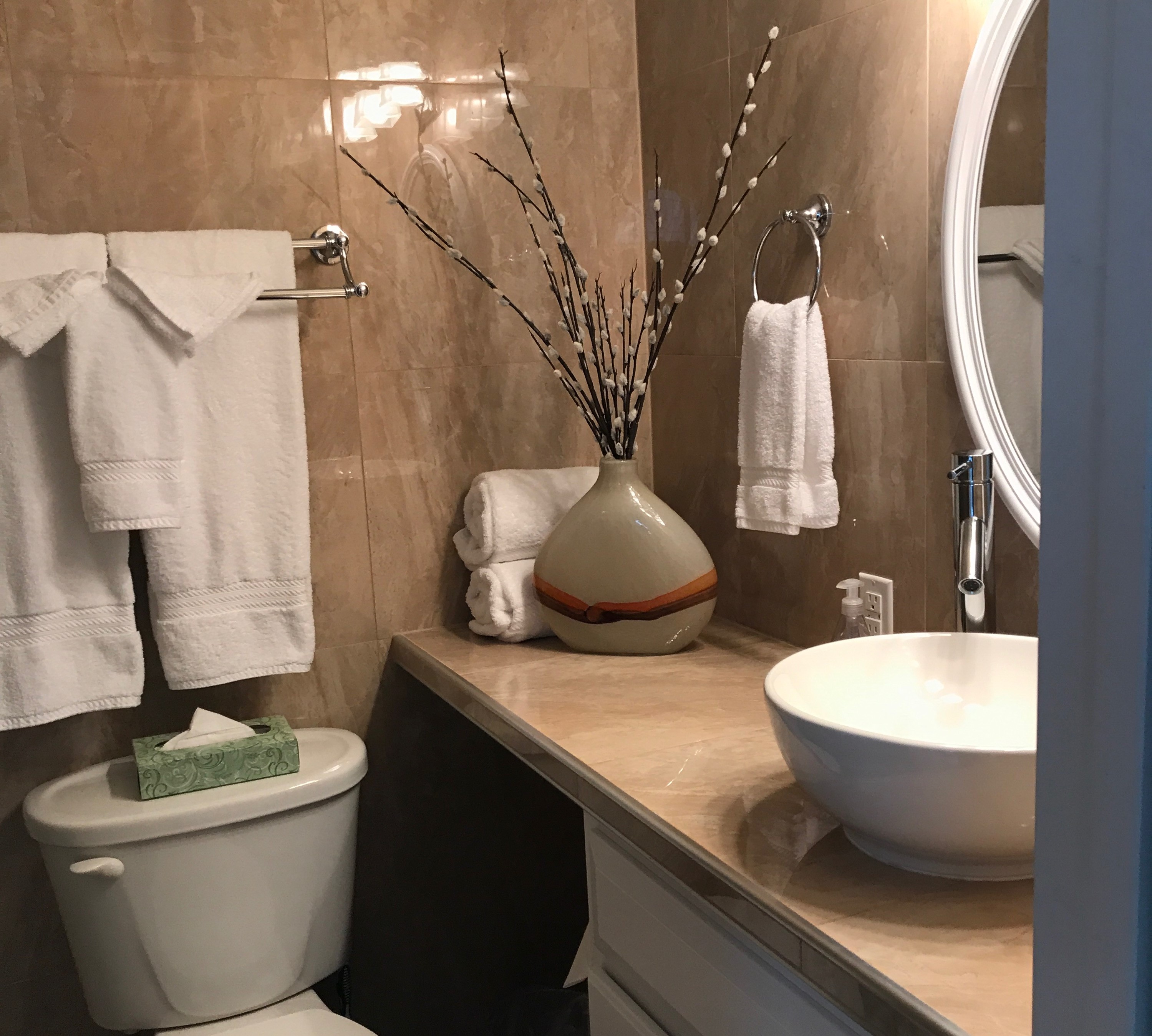 Queen bed and twin bed in each of the two bedrooms, two private ensuite baths, living room, kitchen with standard fridge, stove, coffeemaker, toaster, and microwave. Top floor. Sleeps 6. $299 For up to 4 persons |