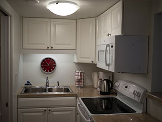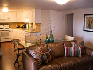 Queen bed in bedroom, private bath and kitchen with standard fridge, stove, coffeemaker, toaster, and microwave. Two single beds (trundle style) in spacious living room. Top floor, magnificent view. Sleeps 4. $189 Double Occupancy |
